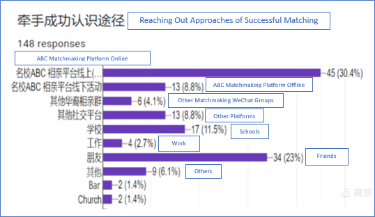 从回答了"牵手成功认识途径"问题的148个反馈里,45位(30.4%) 表示通过本平台线上活动相识, 13位(8.8%)通过本平台各地的线下见面活动相识,34位(23%) 通过朋友或朋友的朋友相识,17位(11.5%) 通过学校及校友因素认识,而13位(8.8%)通过其它相亲平台(App)相识。这里面,直接通过平台渠道认识的快接近40%了!
