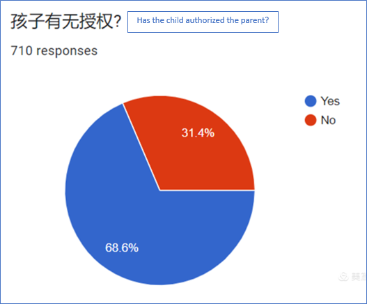 从问卷反馈看,有近七成(68.6%) 家长已经得到孩子明确授权,让父母有机会帮孩子牵线搭桥!咱们义工团队也一向认为,家长不必等孩子完全授权才开始行动。与孩子沟通是一个过程,需要时间,它完全可以与家长在群里参加交流齐头并进,而孩子对家长助缘的看法也将是动态的。