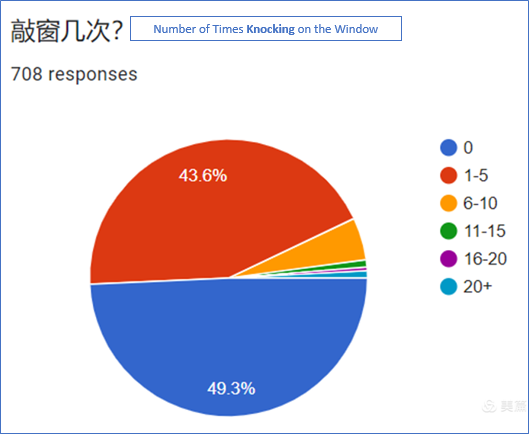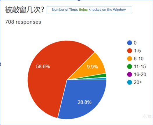 从“被敲窗”角度看,58.6%的家庭被敲过窗1-5次, 28.8%家庭从未被敲窗,而9.9%家庭被敲过6-10次!